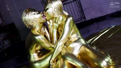 Hara Miori gargles with gold powder, drips gold paint from her mouth onto her partner, lip service, face licking, cunnilingus, body washing, saliva exchange, and Mitsuka licks her partner's anus! 69, clamshell action... and much more, this is a jam-packed, hardcore, and intense messy erotic experience!