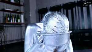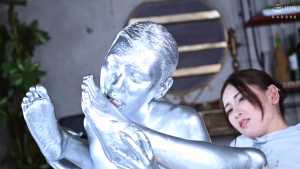 Sasahara, excited by teasing and smearing Takeuchi with silver paint, makes him lick her nipples and, of course, finishes by performing cunnilingus on him.