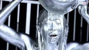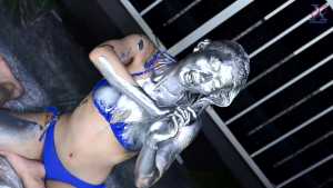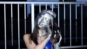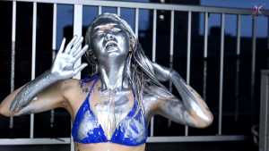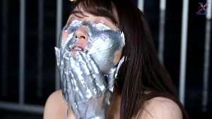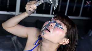 Seika, clad in a bikini, starts off this time with dye on her face! Then she dyes the inside of her mouth, her face and hair, and then her entire body from the neck down... In this way, she paints in the opposite order to the classic painting method.