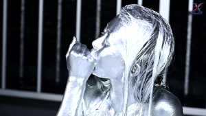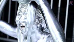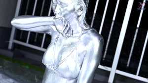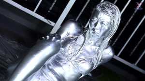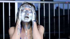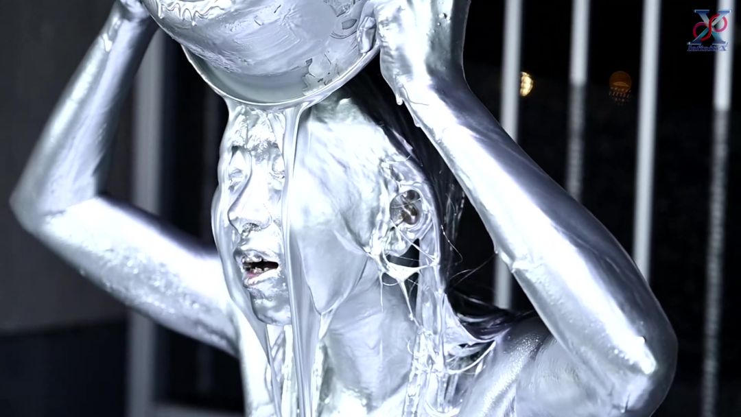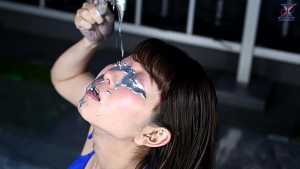 Seika, clad in a bikini, starts off this time with dye on her face! Then she dyes the inside of her mouth, her face and hair, and then her entire body from the neck down... In this way, she paints in the opposite order to the classic painting method.